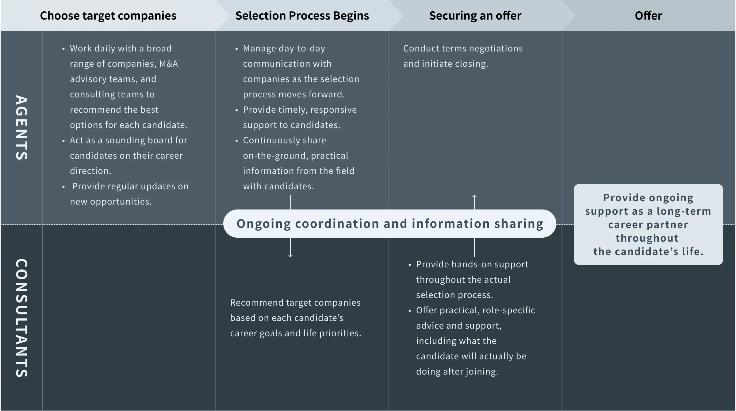 Agents stay close to each candidate, developing a deep understanding of their career goals and strengths while guiding them through every stage of the job transition process. As talent professionals, they serve as trusted advisors, providing guidance on career concerns and offering candid feedback. At the same time, they bring strong expertise in corporate hiring needs. Through continuous support, agents empower candidates to take on new challenges with confidence.
